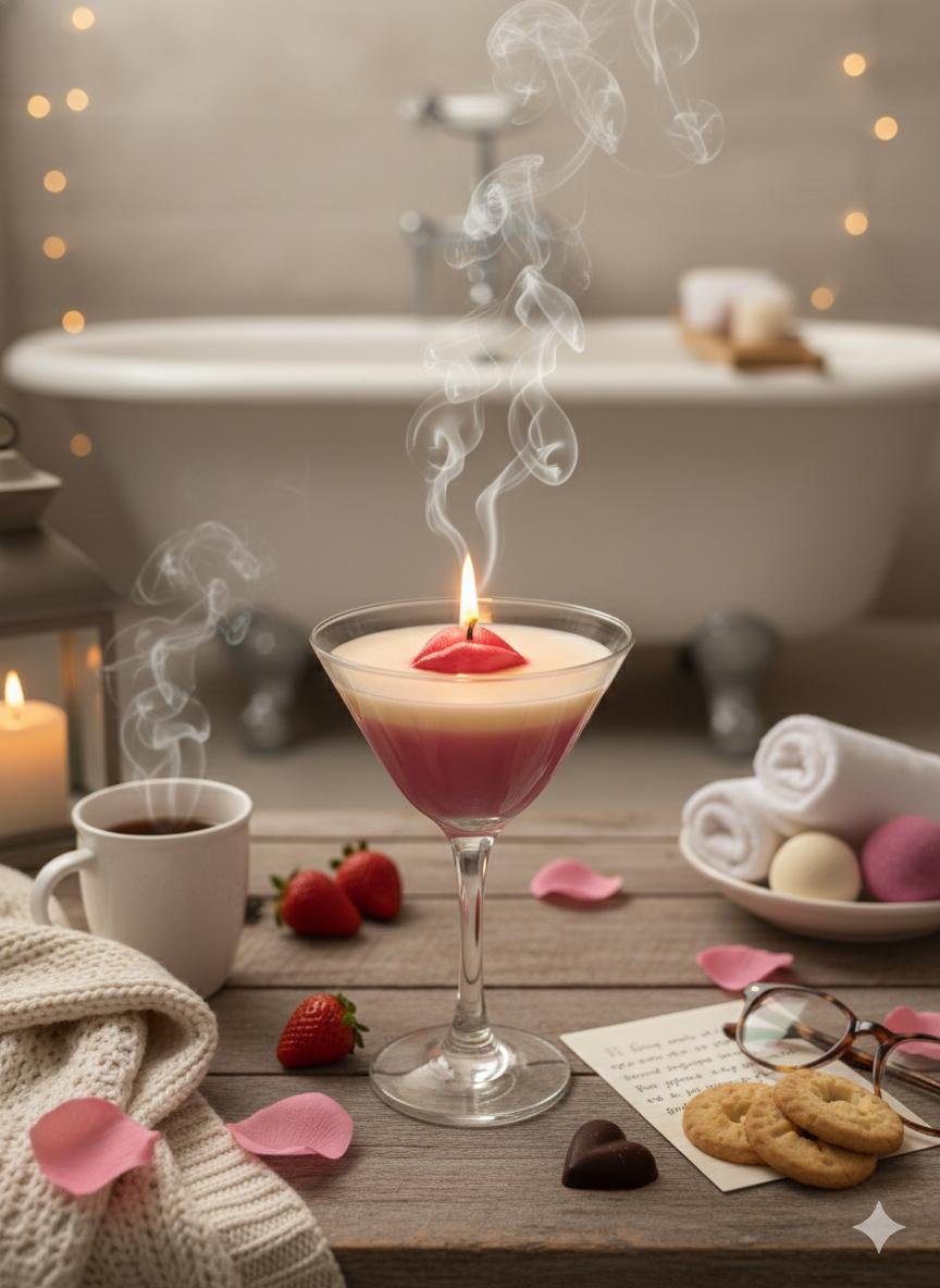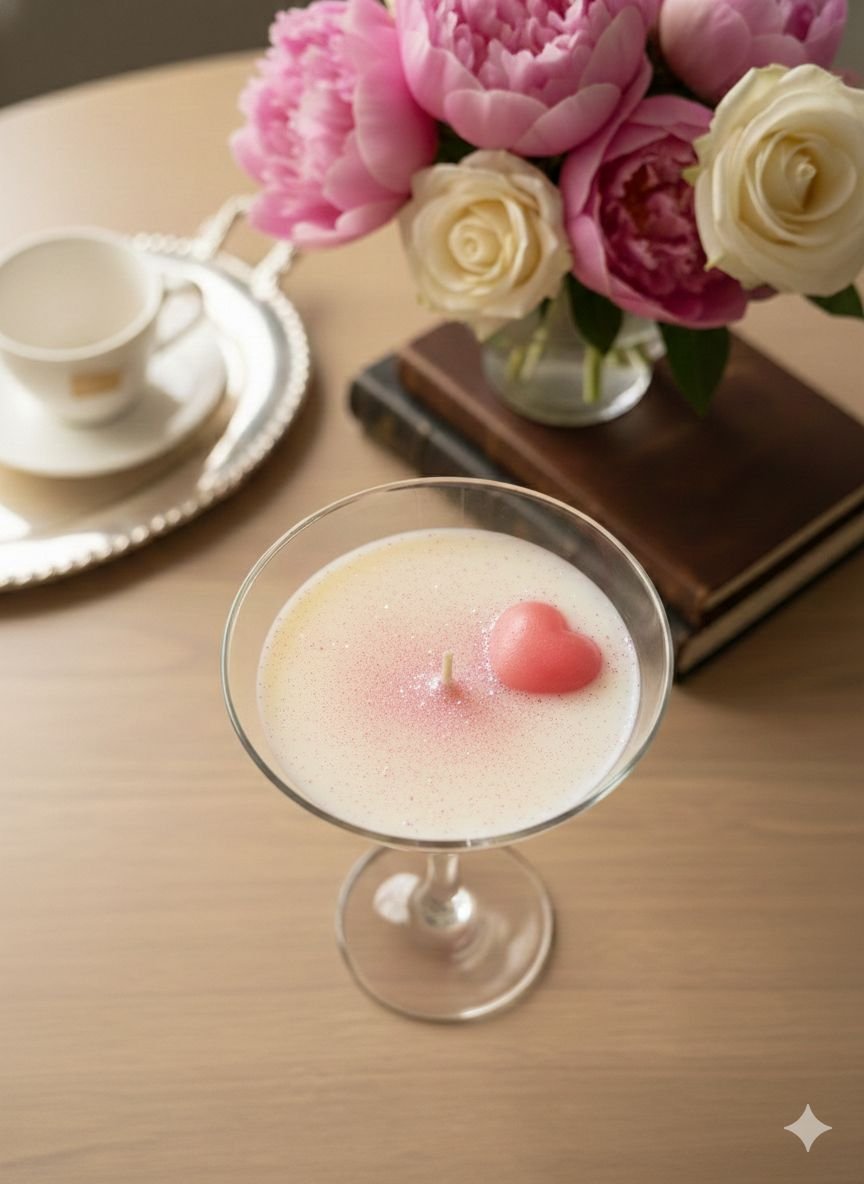 Artisanal Accents: * The “Garnish”: A hand-molded, soft-pink heart wax melt sits atop the surface, mimicking a cocktail garnish while adding a secondary layer of fragrance.