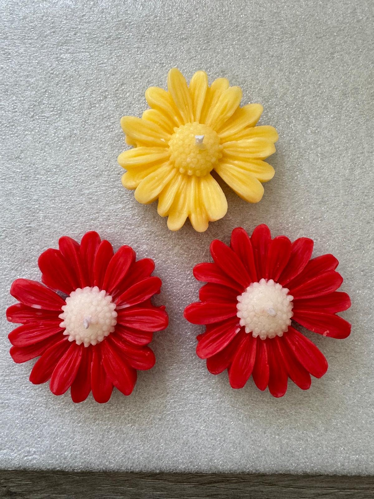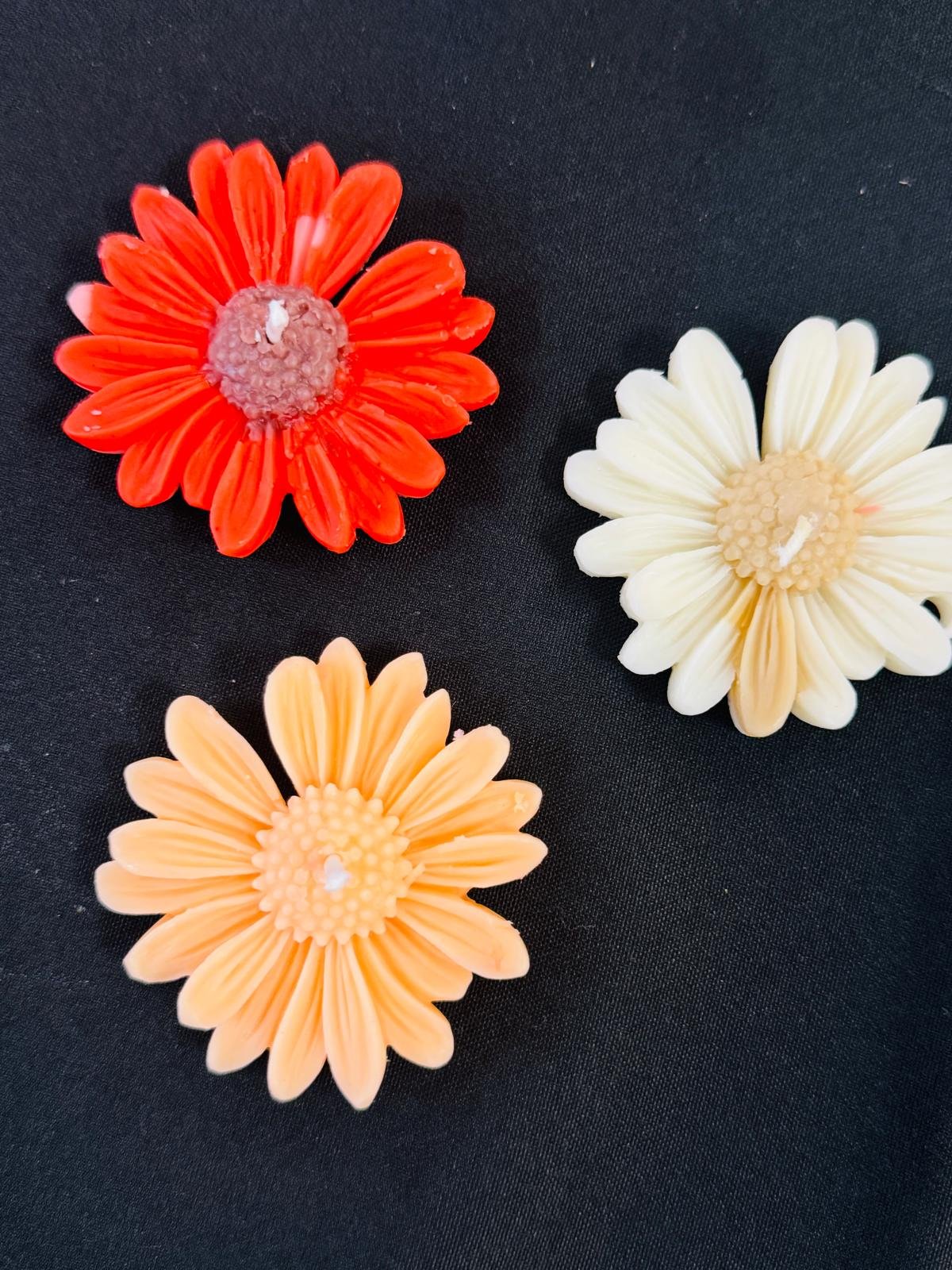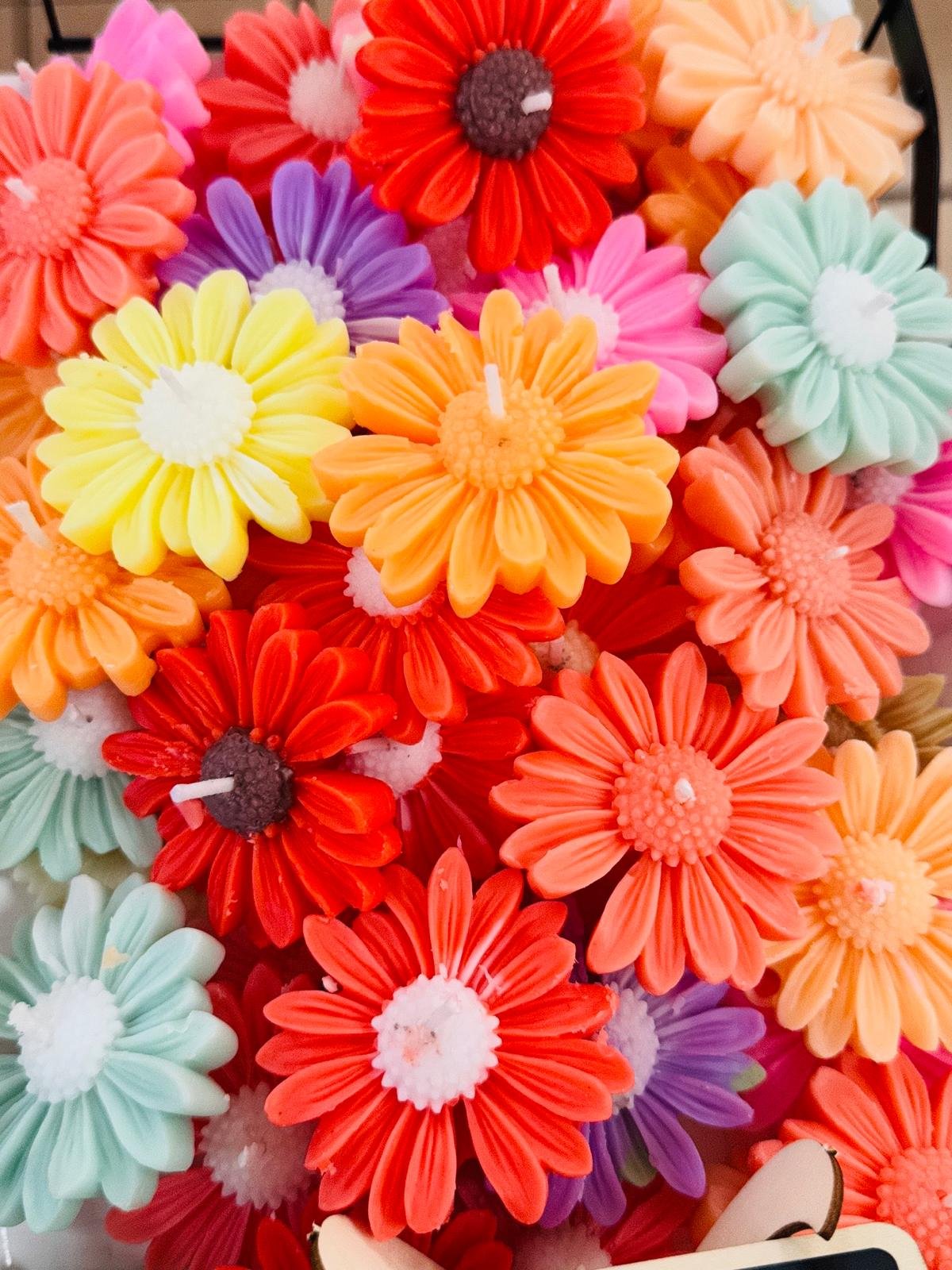 These are beautiful, brightly colored, handmade floral float candles, shaped like Gerber daisies or similar flowers. They come in a variety of vibrant hues, including red, orange, yellow, pink, purple, and mint green, creating a cheerful, colorful display. Each candle has a wick centered in the middle of the flower shape. They are a scented and are designed to float in water for decorative use.
