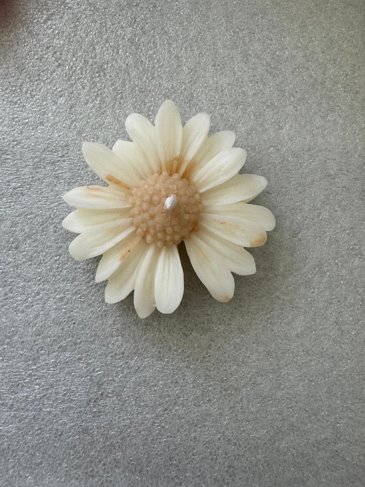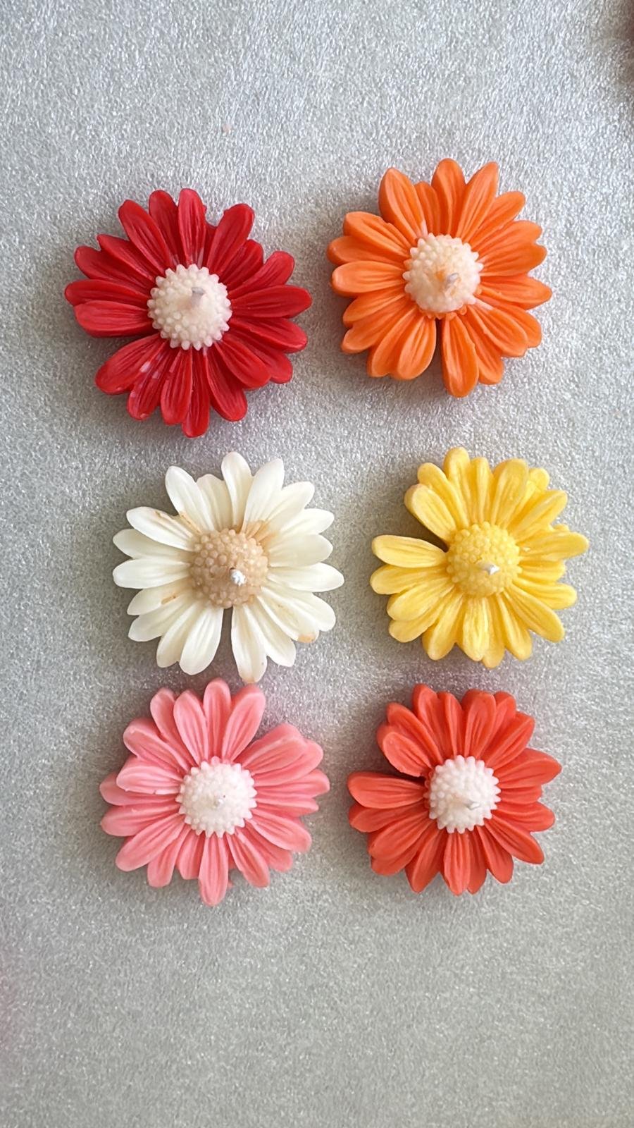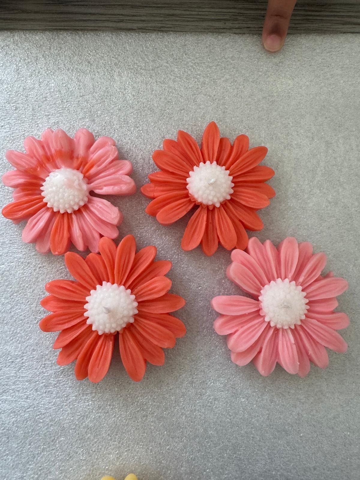 These are beautiful, brightly colored, handmade floral float candles, shaped like Gerber daisies or similar flowers. They come in a variety of vibrant hues, including red, orange, yellow, pink, purple, and mint green, creating a cheerful, colorful display. Each candle has a wick centered in the middle of the flower shape. They are a scented and are designed to float in water for decorative use.